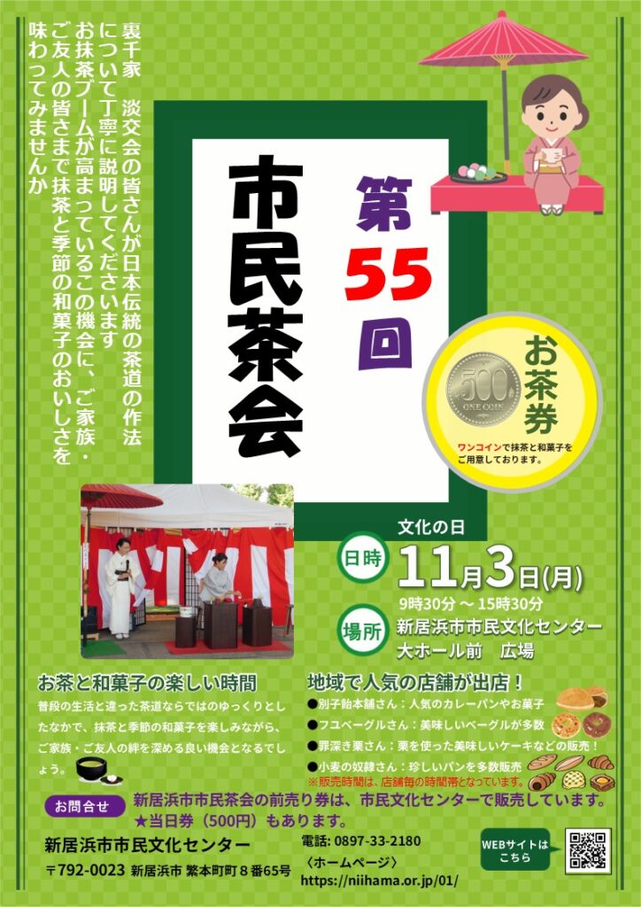 〇 開催日時 令和7年11月3日(月) 文化の日 9:00~15:30 〇 場 所 新居浜市市民文化センター 大ホール前 広場 〇 お 茶 券 500円(前売り券・当日券) 〇 そ の 他 お茶券の前売り券は、市民文化センターにて販売しています。 〇 お問合せ 新居浜市市民文化センター 電話 0897-33-2180
