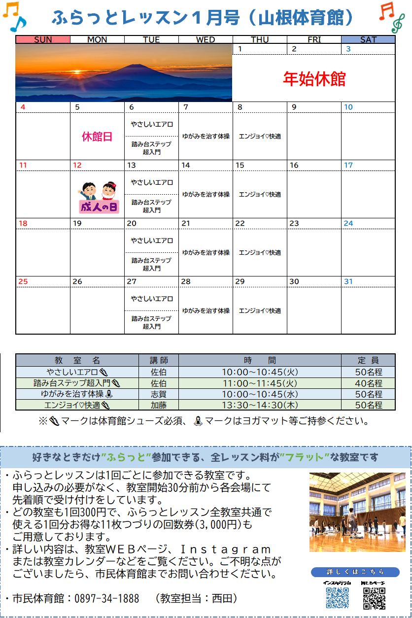 1月のふらっとレッスン案内(山根体育館)