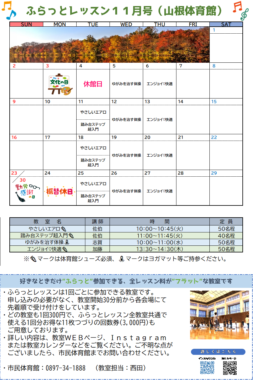 11月のふらっとレッスン案内(山根体育館)
