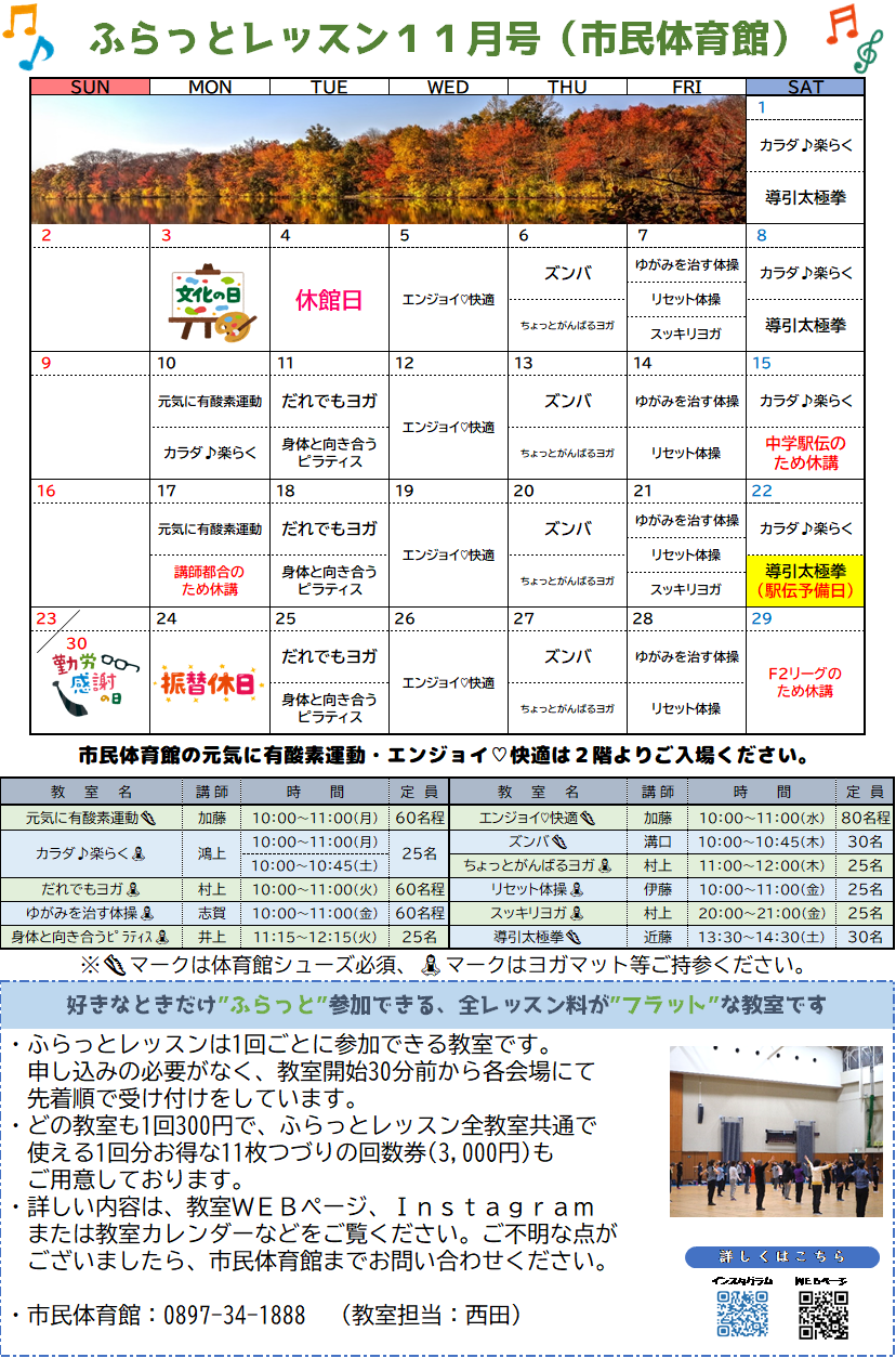 11月のふらっとレッスン案内(市民体育館)